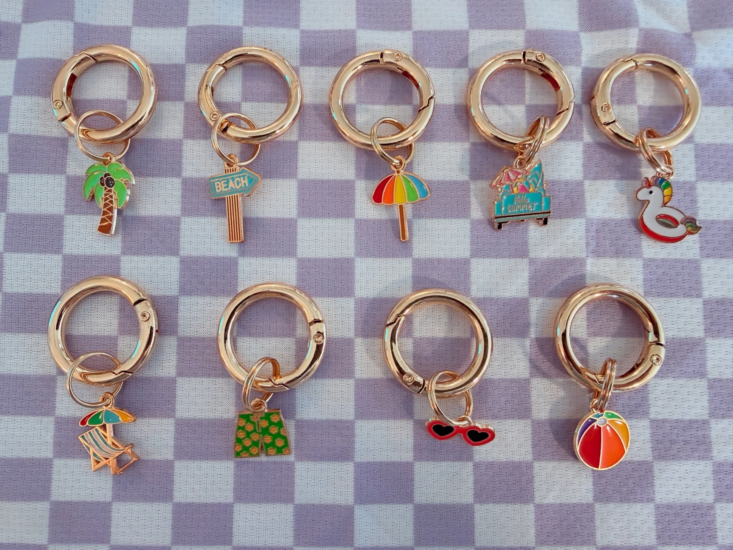 Shop › Summer Charms Image 1 of 1 Summer Charms CA$12.00 Charm:: Palm Tree Beach Sign Stripe Umbrella Blue Car Pool Floatie Beach Chair Swim trunks Sunglasses Beach Ball Add To Cart Added!